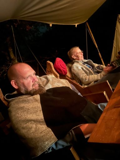 Am Spätnachmittag brach der Tross auf, und bald war der Lagerplatz erreicht. Doch o weh! Die benachbarte Sippe, obgleich nur aus vier Recken bestehend, breitete sich gar großspurig aus, so dass die acht Wölfe gedrängt standen wie Hering in der Bütte. Leif, des Zorns kaum Herr, war nahe daran, den Bannerkrieg zu rufen. Doch Angel, mit sanfter Stimme, und Liv, mit silberner Zunge, vermochten ihn zu besänftigen. Mit listigem Plan ward umdisponiert – nun stand der Axtwurf zwar gegenüber, doch alles fand seinen Platz.