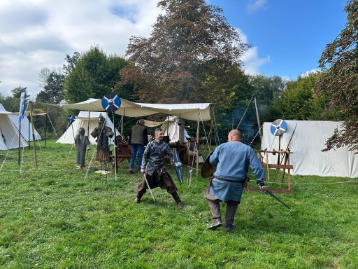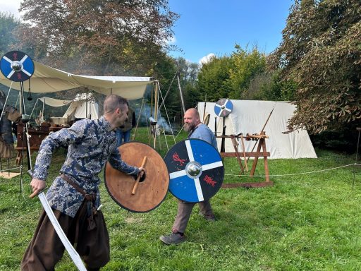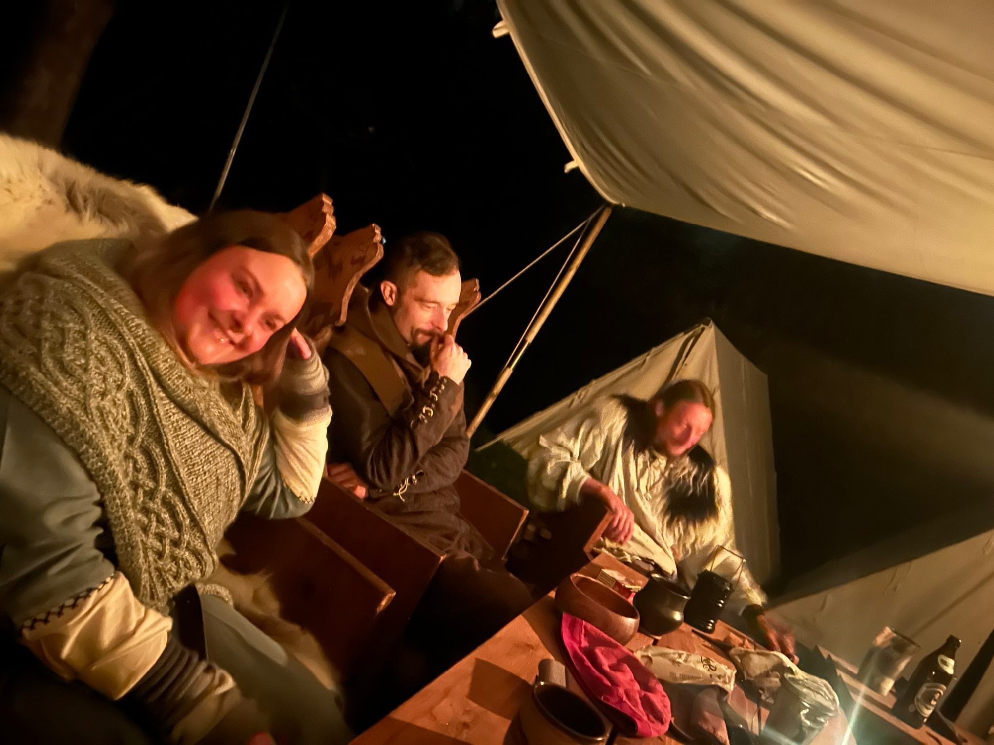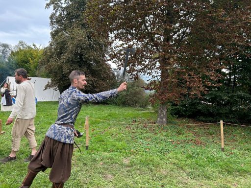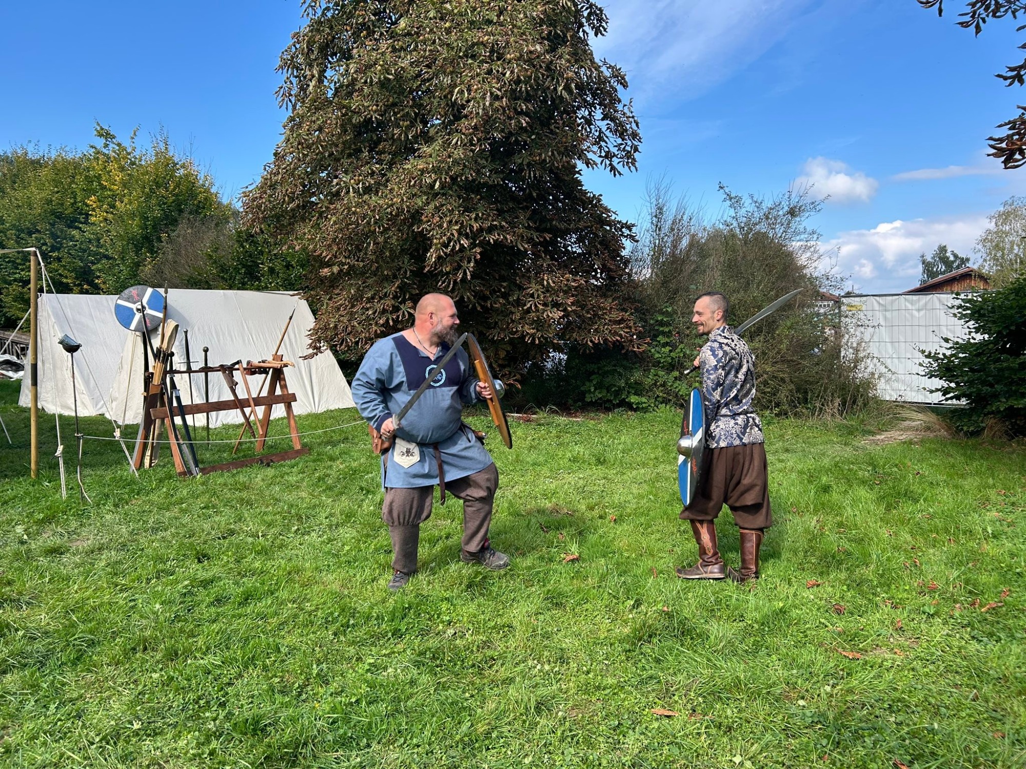 Vidar und Varg standen inmitten des Lagers, gleich zwei fahrenden Erzählern auf dem Dorfanger, und wurden von Neugierigen bestürmt, als hätte man sie zum Weisenrat berufen. Fragen über Waffen, über die Kunst des Axtwurfs, über das Lagerleben – alles wollten die Besucher wissen, und die beiden hielten stand, geduldig, mit einem Augenzwinkern und manch spitzfindiger Antwort.