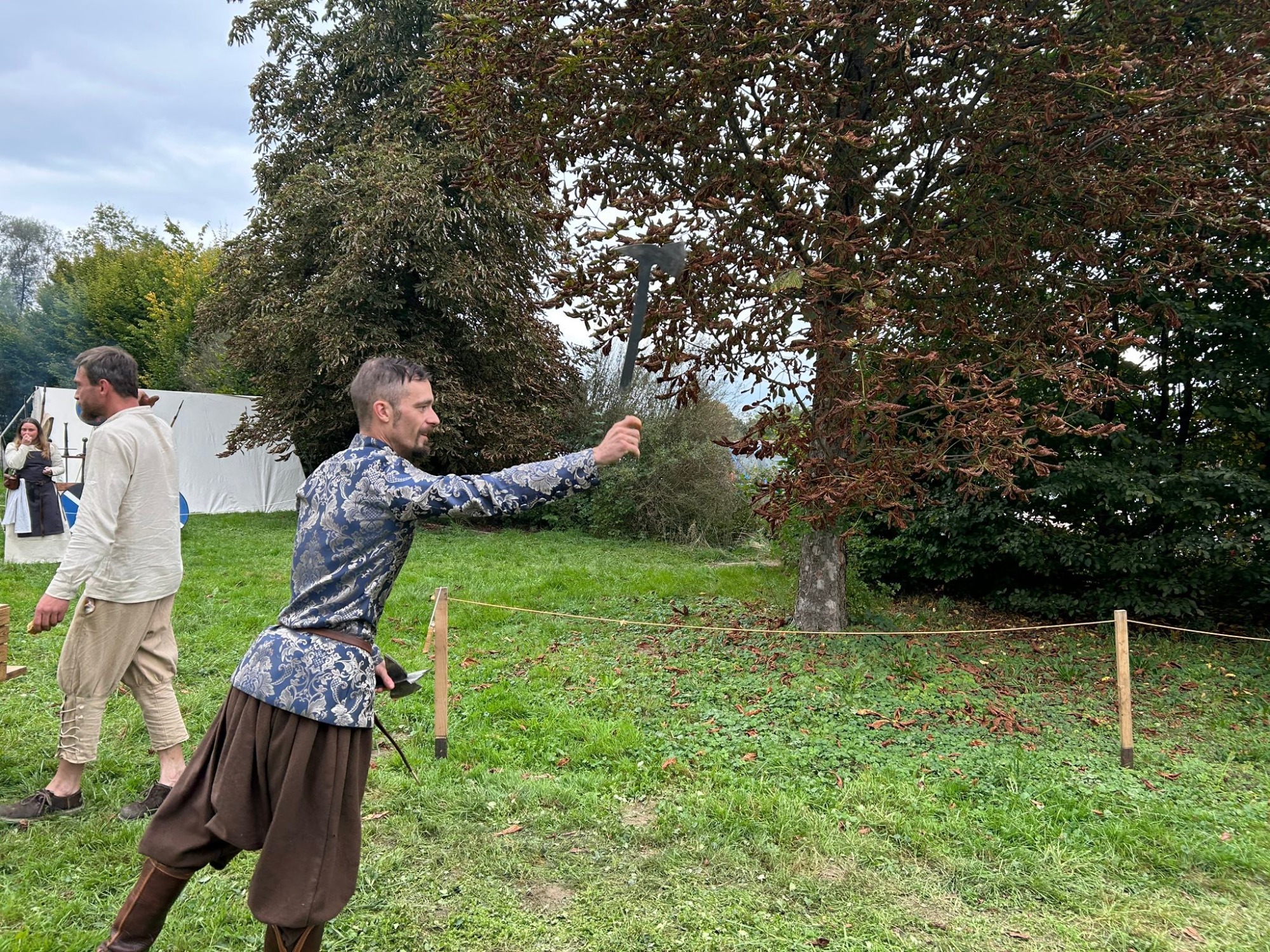 Währenddessen wachten Jörv, der mit sicherer Hand die Äxte durch die Luft tanzen ließ, und Angel, stets mit einem Lächeln und scharfem Blick, über das hölzerne Feld des Wettstreits. Die Axt flog, das Volk jubelte – selbst die Kinder standen ehrfürchtig vor dem Zaun, als wäre es ein Wunder, das sich vor ihren Augen vollzog.