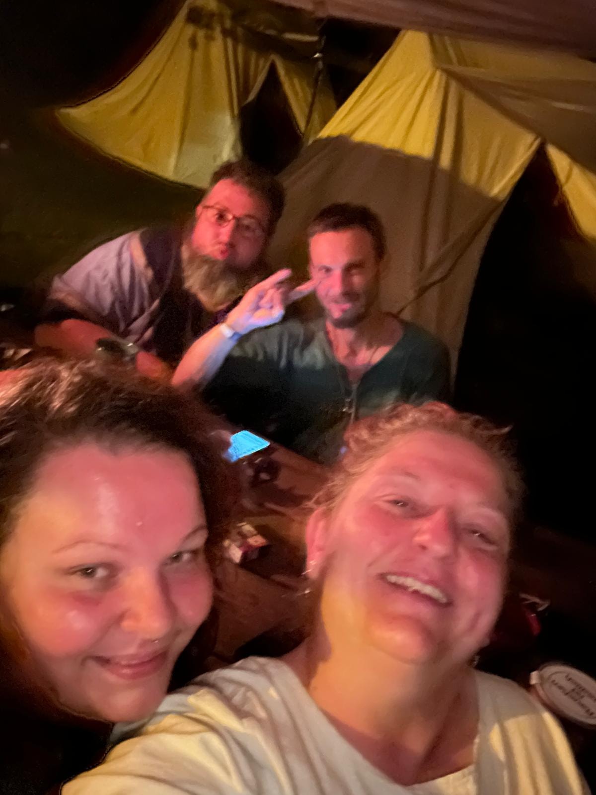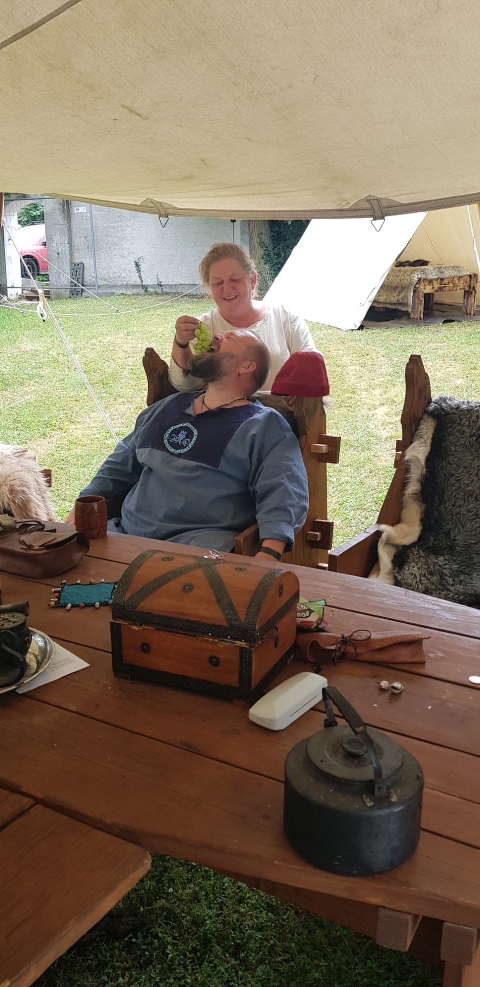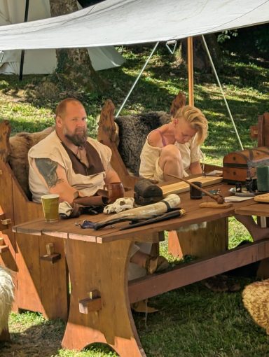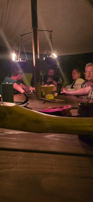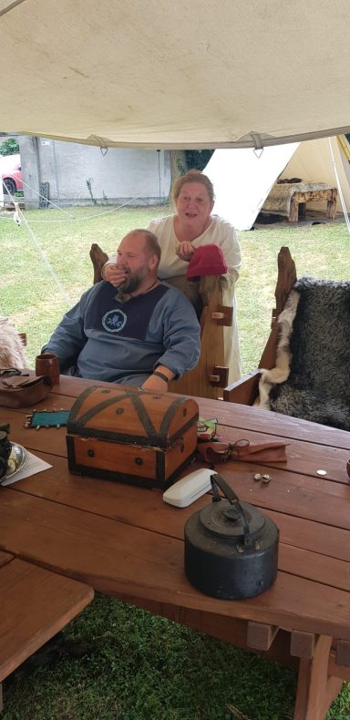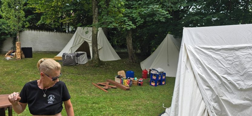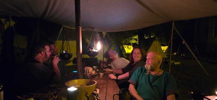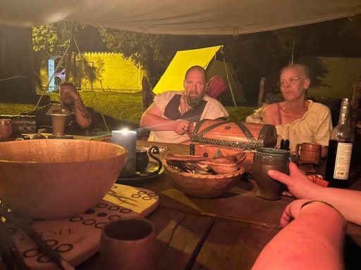 Doch spät in der Nacht, als Leif und Angel schon schliefen, ward das Lager von lautem Gelächter gestört. Erik bemühte sich um Ruhe – vergebens. Da trat Angel entschlossen vor die Tafel. Die 22’er hatten sich dort breitgemacht. Mit fester Stimme wies sie sie zurecht – und siehe da, es ward Ruhe. Schnell verabschiedeten sich die 22`er und sie konnte zurück zu ihrem Gemahl.