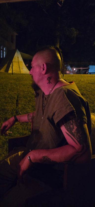 Nach dem Mahle zog sich der Medicus zur Ruhe zurück. Die Jarle wanderten durch die Lager, als plötzlich Sheldon, der Hund, laut zu bellen begann. Angel horchte auf. „Ist das unser Hund?“ Schon eilte sie mit Leif zurück – ein Fremder war im Lager, betrunken und schwankend.